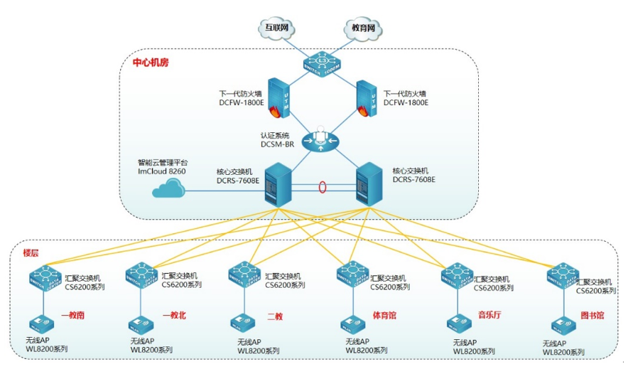 为方便用户对无线管理和维护,提升用户无线体验,使无线更智能化,此次采用聚享游(中国)智能云管理平台ImCloud 8260实现无线统一的管理、维护、认证,并可实现对全网无线设备管理、实现易部署、易维护、易扩展的无线网络。聚享游(中国)云管理ImCloud方案是网络服务的新模式,基于云端实现网络服务和管理,将复杂的网络管理简单化、智能化、可视化,提升用户网络体验。同时为了保证无线的安全,无线采用Portal准入认证,云管理ImCloud聚享游(中国)身份认证系统DCSM-BR实现联动,用户需要顺利获得账号和密码认证成功后才能接入无线网络,在保证无线连接的便捷性同时兼顾无线的安全性。