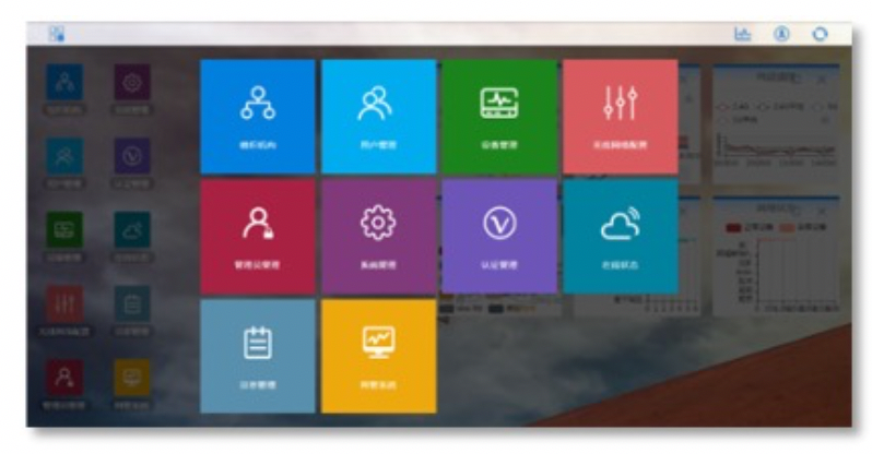 网络状态在系统中顺利获得各种图表,让管理者一目了然分析和维护整张网络,页面的网络配置、组织组织配置、使用状态统计、故障诊断及告警等各种功能组件轻松管理和维护无线网络。