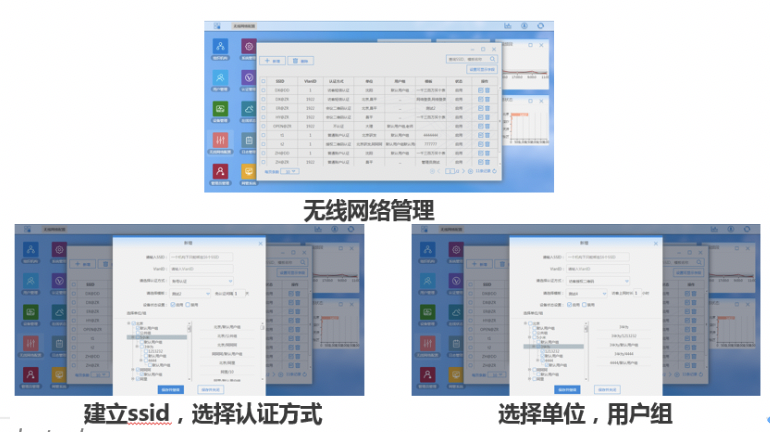 对全网的网络设备、无线用户、网络状态集中监控,并统一配置全局无线网络,对全局设备进行统一升级,用户身份统一认证,统一下发认证页面。
